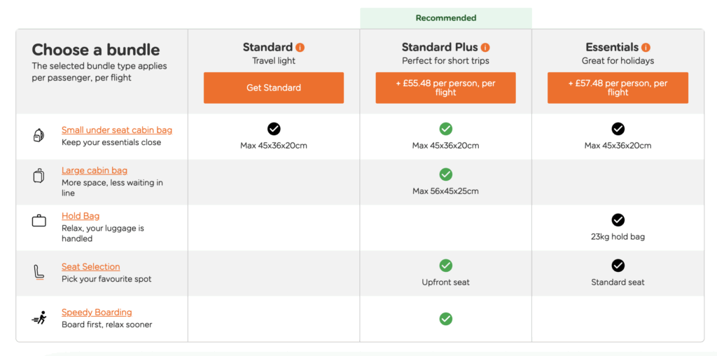 例えば、ヨーロッパのLCCの代表格のeasyjetでは、大きな荷物を預けるのに、プラスで55ポンド(約1万円)ほど追加料金かかります。(下の画像のStandard Plus)