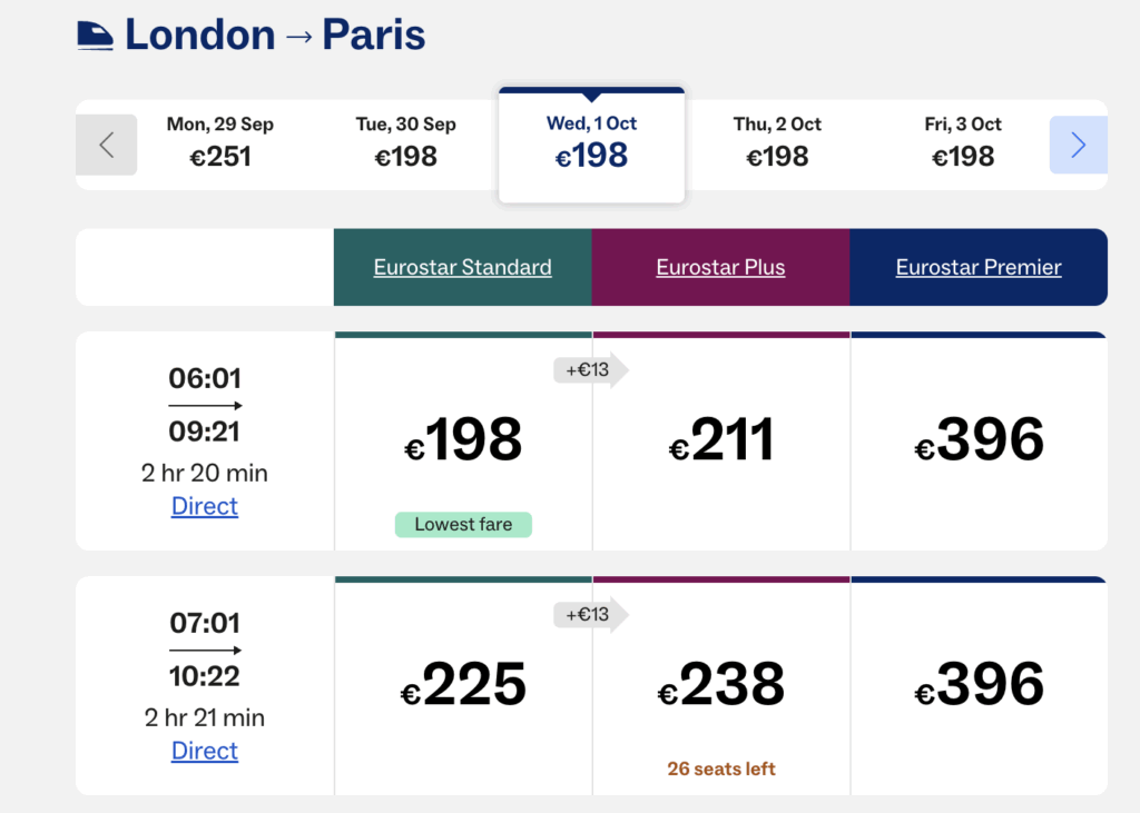 例えば、ロンドンからパリへの直近の電車を見てみると、片道 約200-400ポンド(4-8万ほど)でした。