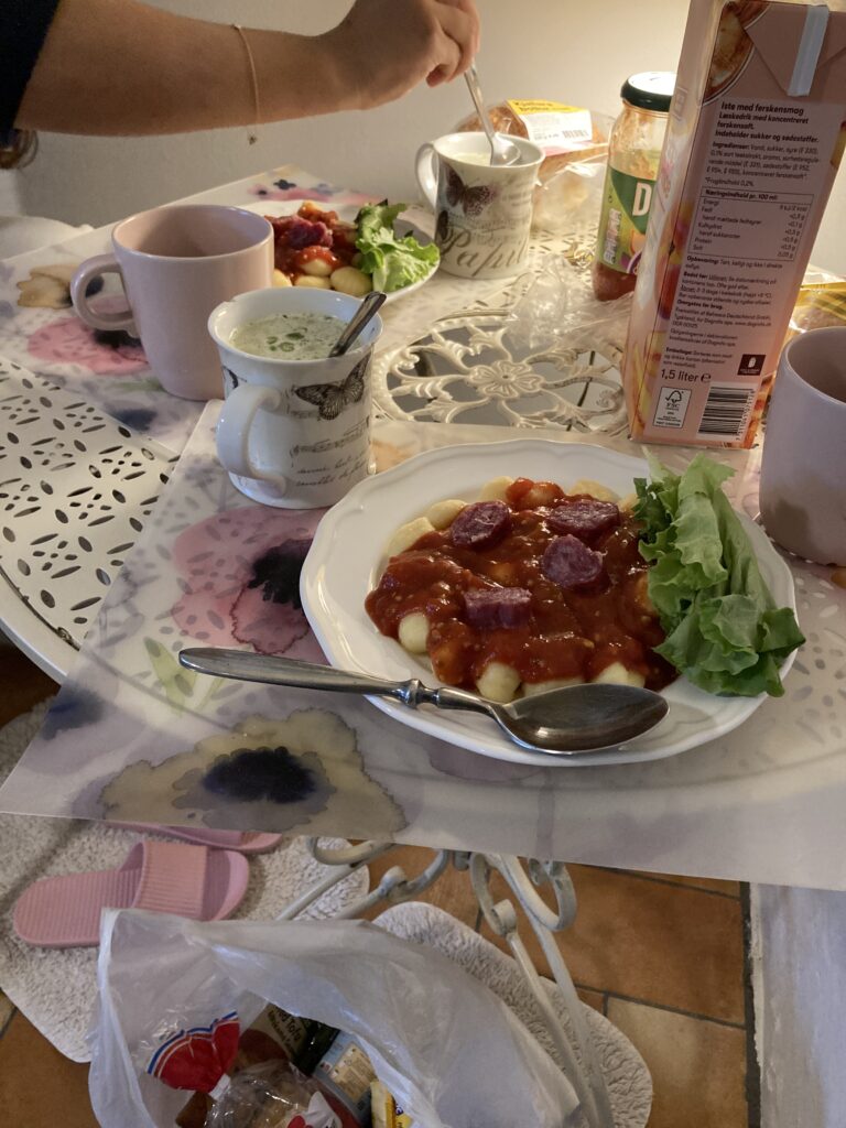 事前に買い出しをしていたので、それで夕飯を作ります。今日はニョッキにハムとパスタソースをかけて、サラダを少し。