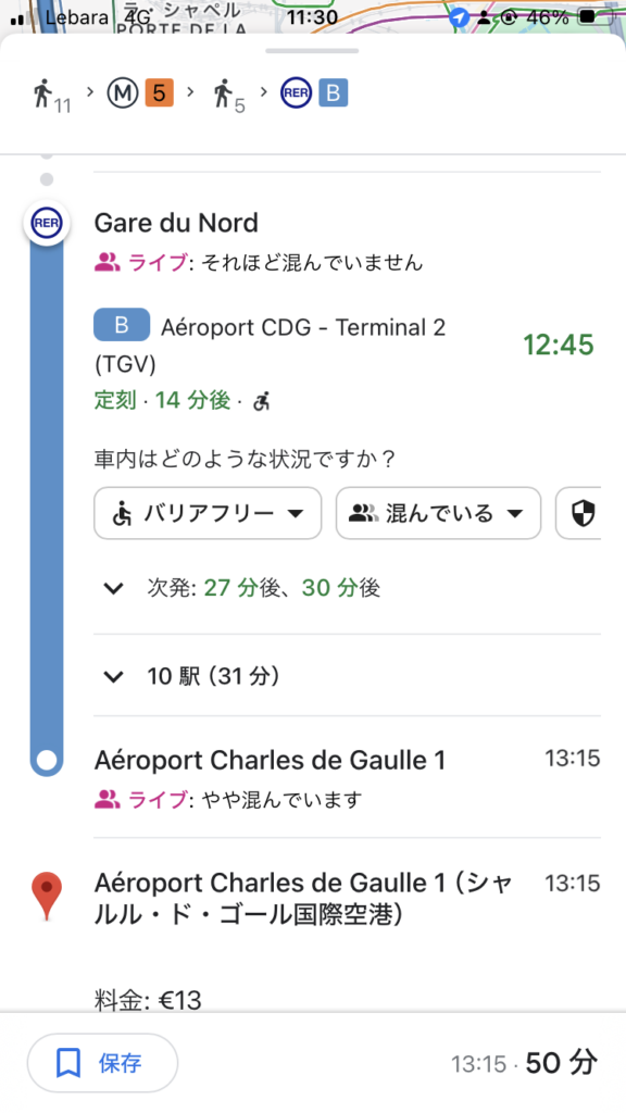 こんな感じで、Citymapperで検索をすると、どのぐらい混んでいるか、何駅先に行くか、パリの各線の色も忠実に出してくれるので、非常にわかりやすいです。